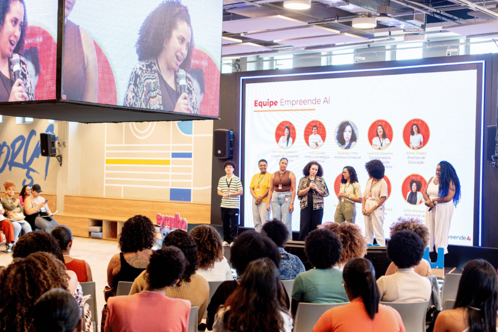 O encontro também contou com a participação do time da Empreende Aí, responsável por conduzir toda a jornada do projeto. Profissionais das áreas de Comunicação, Educação e Projetos subiram ao palco para se apresentar e mostrar os rostos que, mesmo nos bastidores, são essenciais para que cada detalhe do curso aconteça com acolhimento, qualidade e impacto real.
