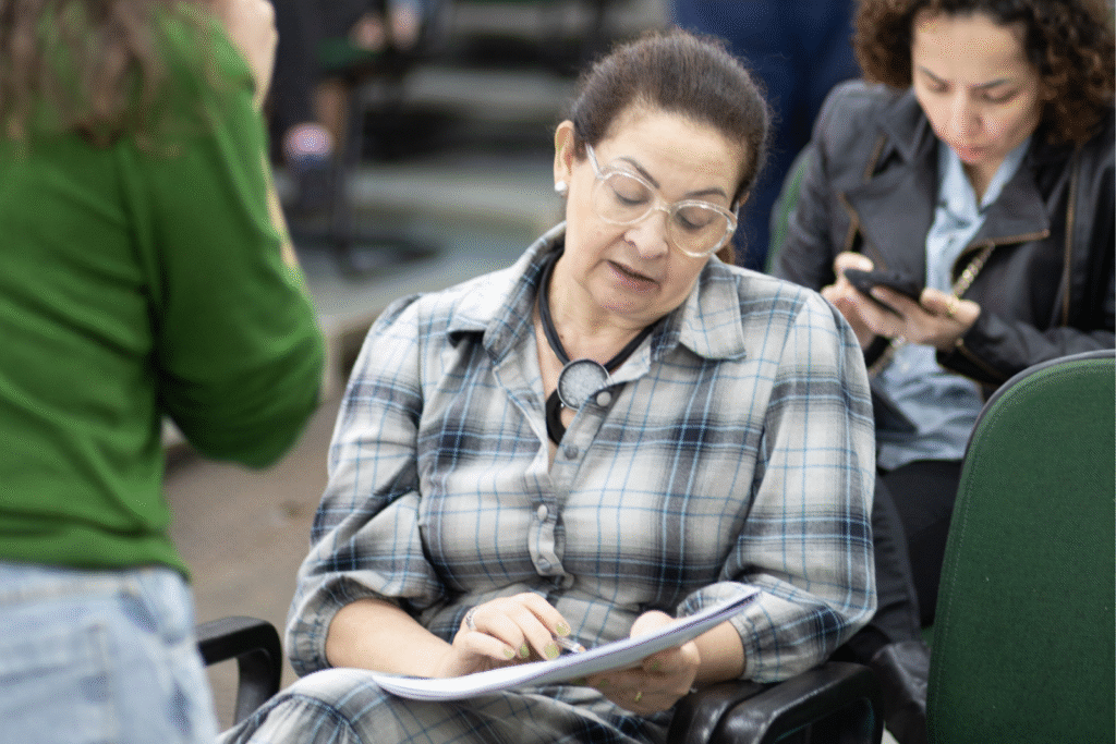 Empreendedora lendo a apostila. Imagem por: Maicom Sturm.